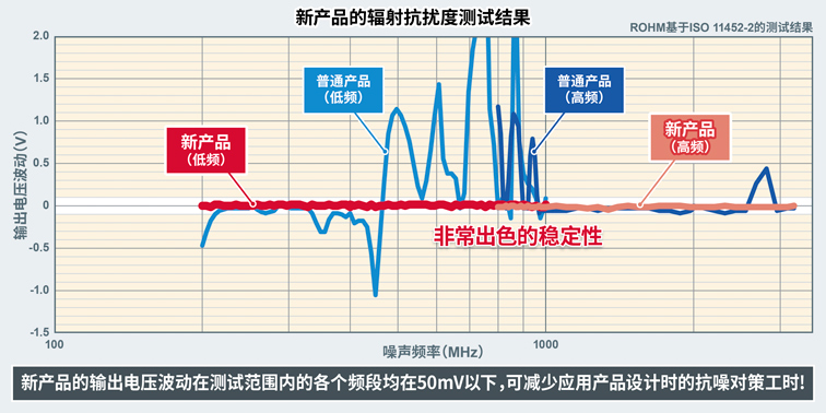 新产品不仅体积小巧(2.9mm×2.8mm),还实现了高耐压(Max.=45V)和低消耗电流(Typ.=6μA),可满足构建需要持续工作的冗余电源时的主要需求。另外,利用ROHM擅长的模拟控制技术,使得在电池电压剧烈波动的情况下也能确保稳定的输出电压。在相同条件下进行比较时,普通产品会出现最大超过1.2V的过冲,因此需要通过添加大容量输出电容器等方法来防止电压超过辅助微控制器等后级器件的额定电压。新产品的过冲仅为0.1V左右,因此支持输出电容器的小型化。与使用普通产品的冗余电源电路相比,使用新产品时电路板面积还可缩减约29%,从而能够通过添加更小规模的电路来构建冗余电源。此外,新产品还具有出色的抗干扰能力,在ISO 11452-2辐射抗扰度测试中,输出电压在测试范围内的各个频段几乎都没有波动,从而有助于减少应用产品设计时的抗噪对策工时。