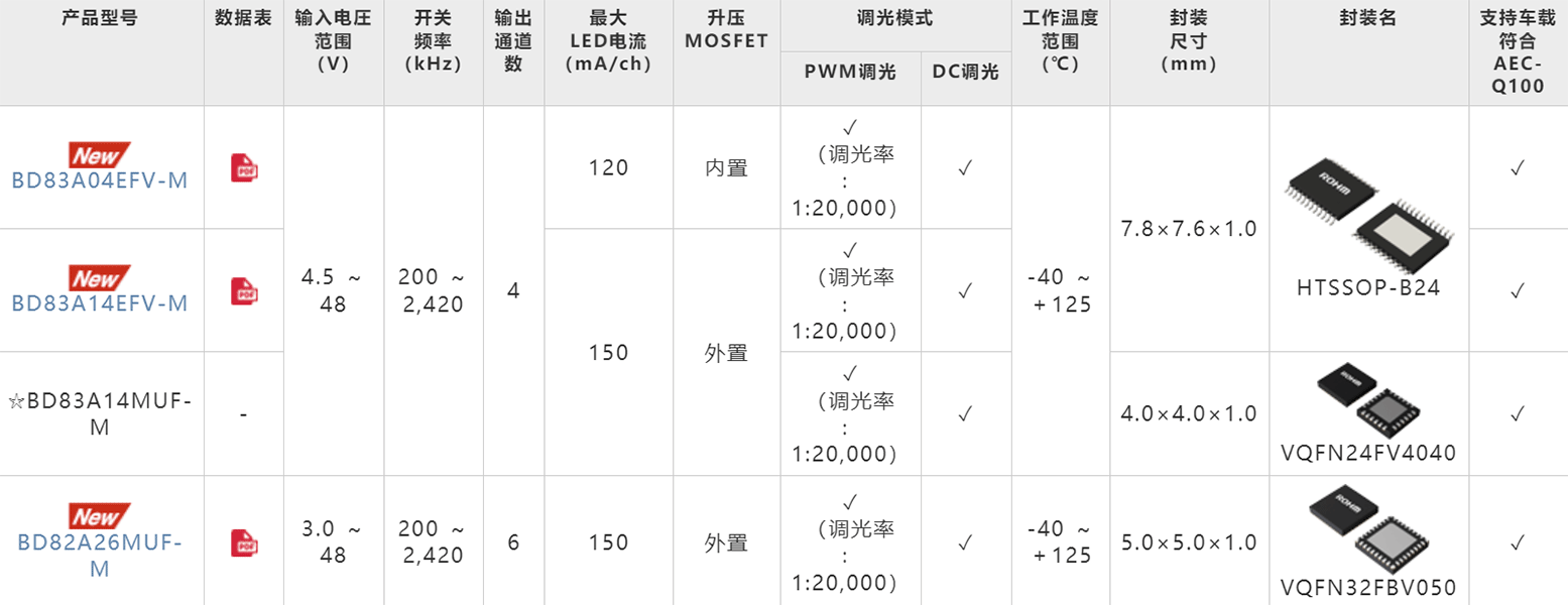 全球知名半导体制造商ROHM(总部位于日本京都市)针对车载信息娱乐系统和车载组合仪表等应用,成功开发出适用于中型车载显示器的4通道LED驱动器IC“BD83A04EFV-M”、“BD83A14EFV-M”,以及适用于大型车载显示器的6通道LED驱动器IC“BD82A26MUF-M”。