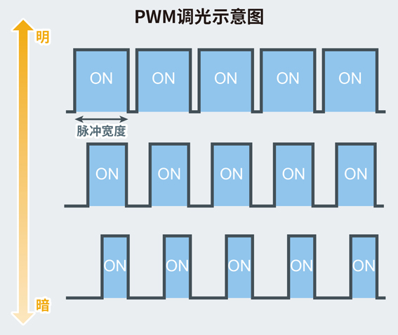 当LED以超高速度进行ON/OFF交替时,视觉上看起来就像LED一直处于点亮状态。PWM调光就是基于该原理,通过调整亮灯时间(脉冲宽度)的长短,来调节LED明暗程度的调光方法。通过LED驱动器,进行开关的控制,实现脉冲宽度的设定。因为该调光方式的明暗调整范围较大,所以广泛应用于液晶背光以及指示灯的LED的亮度调节。但是根据其规格,有出现闪烁的风险。