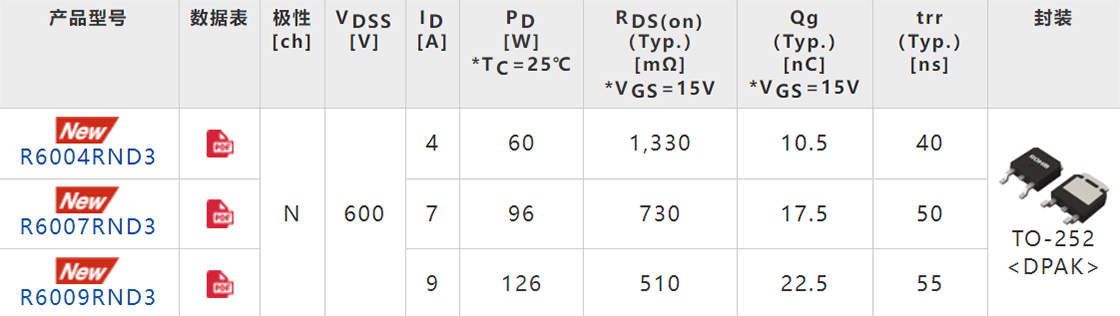 在这种背景下,ROHM于2012年实现了具有业内超快反向恢复特性的Super Junction MOSFET PrestoMOS™的量产,并且,由于该系列产品可大大降低设备的功耗而受到市场的高度好评。在此基础上,此次ROHM又推出“R60xxRNx系列”3款新产品,新产品通过优化结构而同时实现了业内出色的低噪声特性和业内超快的反向恢复时间。