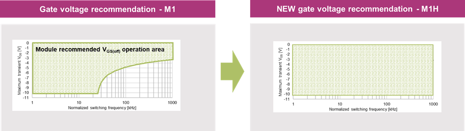 答:阈值漂移,本质上是栅极氧化层中的缺陷,捕获了不该属于它的电子,氧化层中电子日积月累,就会造成阈值降低。所以要规避这种现象,芯片设计中要改善氧化层的质量。M1H就是改善了氧化层的质量,实现了方形门极电压操作曲线,也就是说不管什么开关频率,都可以使用负压下限-10V了。