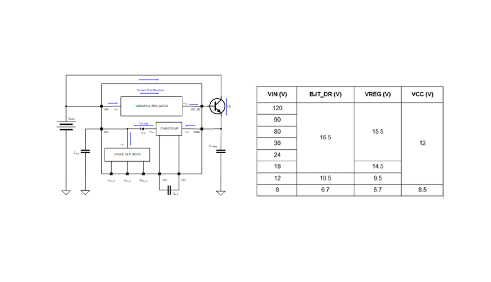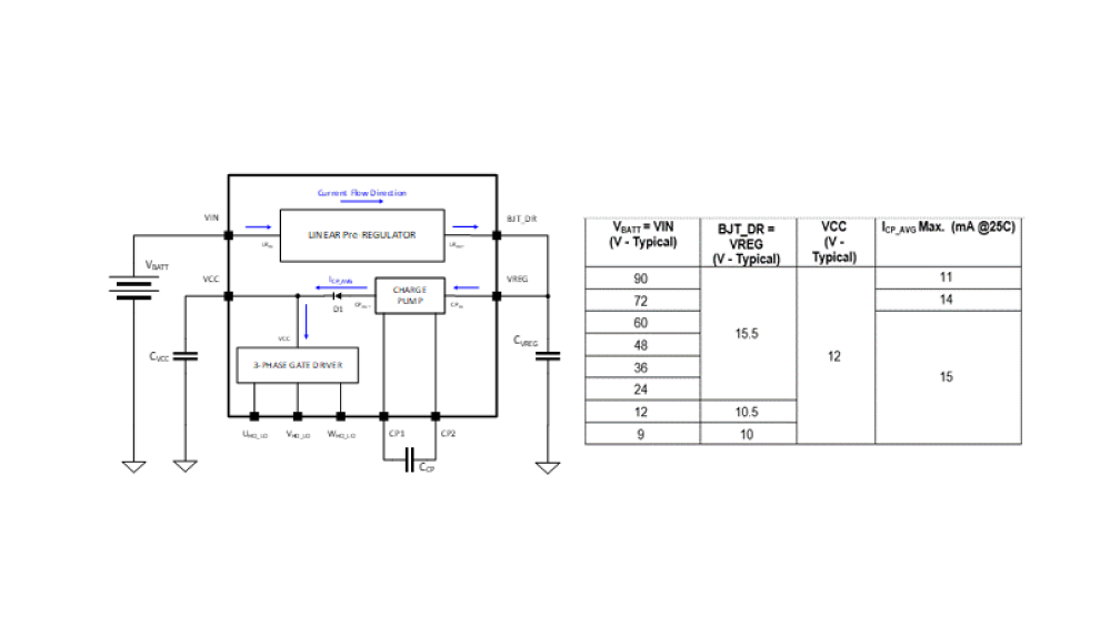 如果电池电压在20V~90V之间,可将电池直接连接VIN。此时电池电压经一级LDO降至15.5V,再通过电荷泵得到12V的VCC电压。电池电压高于60V的时候,电荷泵的输出电流会ICP_AVG低于15mA。