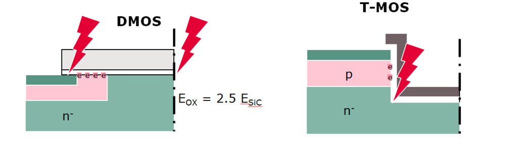 - 与硅器件相比,SiC器件在阻断模式下的漏极诱导电场要高得多(MV而不是kV)。这就需要采取措施限制栅极氧化物中的电场,以保持氧化物在阻断阶段的可靠性。另见图3:对于TMOS(沟槽MOSFET),薄弱点是沟槽拐角,而对于DMOS(双扩散金属氧化物半导体),薄弱点是元胞的中心。