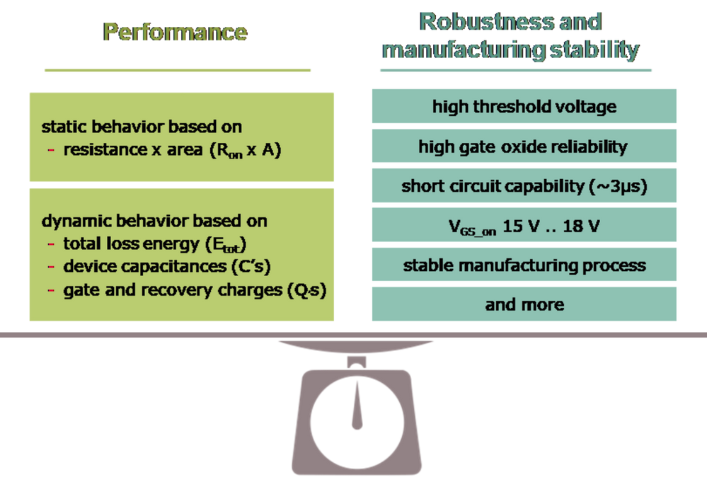图1:SiC MOSFET的鲁棒性和制造稳定性(右)必须与性能参数(左)相平衡