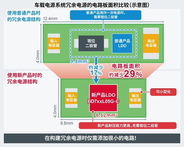 全球知名半导体制造商ROHM(总部位于日本京都市)开发出支持高达45V的额定电压、50mA输出电流的一次侧*1LDO稳压器*2(以下简称“LDO”)“BD7xxL05G-C系列”(BD725L05G-C、BD730L05G-C、BD733L05G-C、BD750L05G-C),该系列产品非常适用于各种冗余电源*3,用于车载应用中,可提高车载电源系统的可靠性。