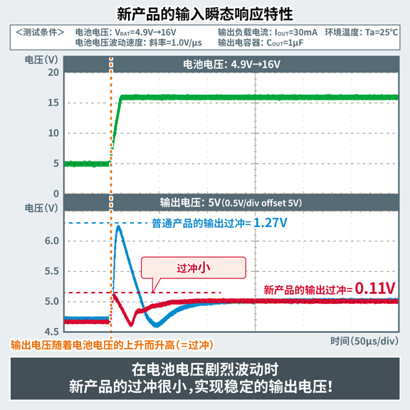新产品不仅体积小巧(2.9mm×2.8mm),还实现了高耐压(Max.=45V)和低消耗电流(Typ.=6μA),可满足构建需要持续工作的冗余电源时的主要需求。另外,利用ROHM擅长的模拟控制技术,使得在电池电压剧烈波动的情况下也能确保稳定的输出电压。在相同条件下进行比较时,普通产品会出现最大超过1.2V的过冲,因此需要通过添加大容量输出电容器等方法来防止电压超过辅助微控制器等后级器件的额定电压。新产品的过冲仅为0.1V左右,因此支持输出电容器的小型化。与使用普通产品的冗余电源电路相比,使用新产品时电路板面积还可缩减约29%,从而能够通过添加更小规模的电路来构建冗余电源。此外,新产品还具有出色的抗干扰能力,在ISO 11452-2辐射抗扰度测试中,输出电压在测试范围内的各个频段几乎都没有波动,从而有助于减少应用产品设计时的抗噪对策工时。