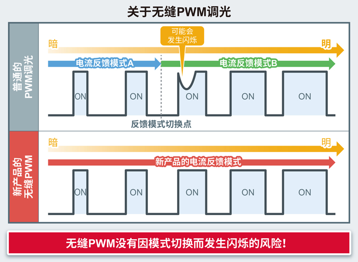 新产品通过采用ROHM自有的低功耗技术,成功降低了LED驱动器电流控制电路中的损耗。因此,在常规的规格条件下(LED电路电流:80mA/ch,电源电压:12V),相比以往产品,IC整体的功耗可降低20%左右,在配有中、大型车载显示器的应用中使用这些新产品,有助于进一步改善此类应用的关键问题——功耗。另外,此次推出的各款新产品均配备DC调光*1和PWM调光*2两种调光方式,可以支持多种规格。而且,PWM调光还采用了ROHM自有的无缝PWM调光技术,从低亮度区间到高亮度区间,不需要切换其电流反馈模式。采用普通PWM调光方式时,低亮度和高亮度时的电流反馈模式切换是造成闪烁的原因。此次的新产品无需电流反馈模式的切换,因而可以降低发生闪烁的风险,有助于提高应用产品的可靠性。