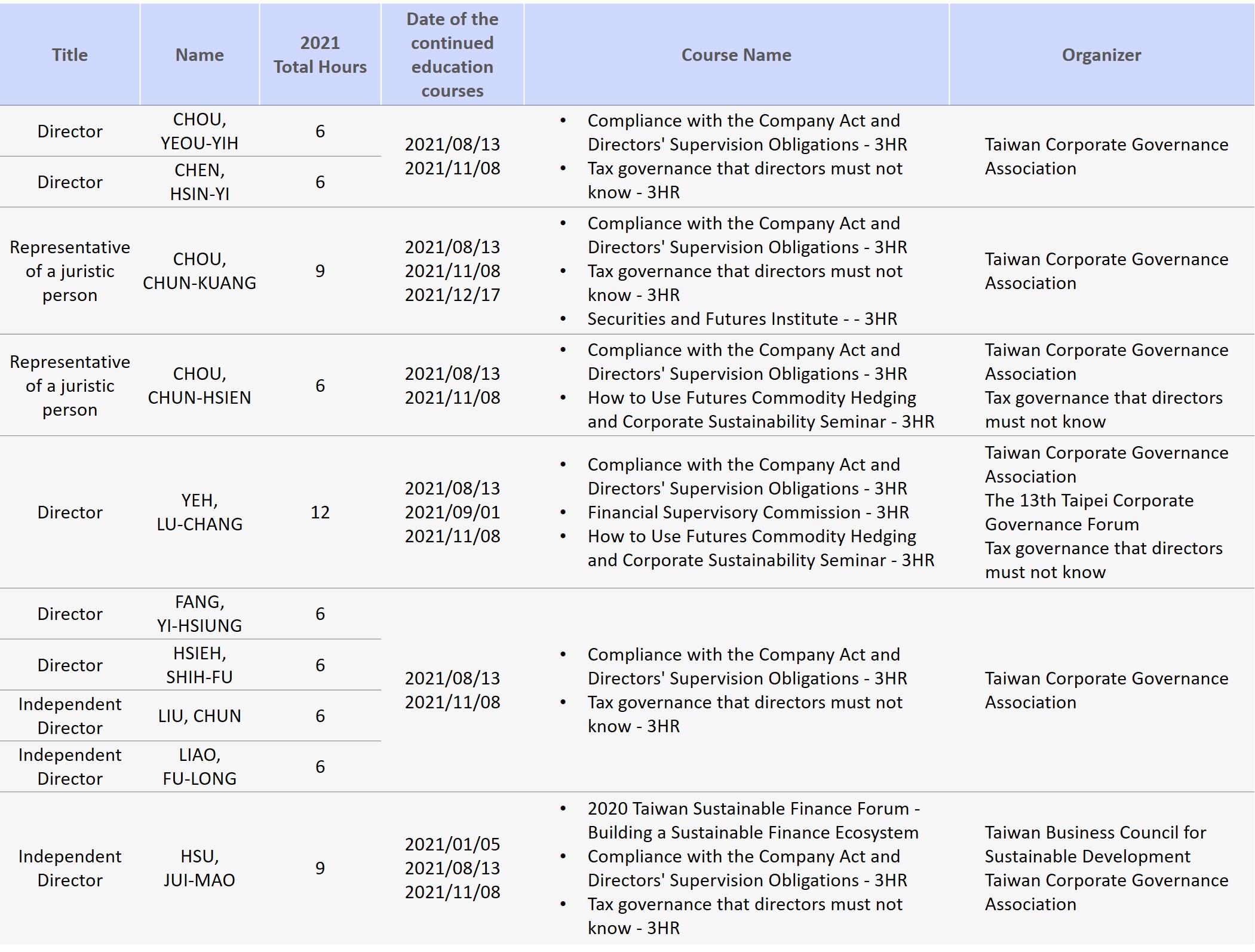 All directors (including independent directors) of the Company have a background in finance, business, accounting, information, etc., and their education has been entered into the Market Observation Post System in accordance with the regulations. The accountants and legal advisors appointed by the Company also provide appropriate legal advice to help enhance their legal literacy and avoid the possibility of violating the law.