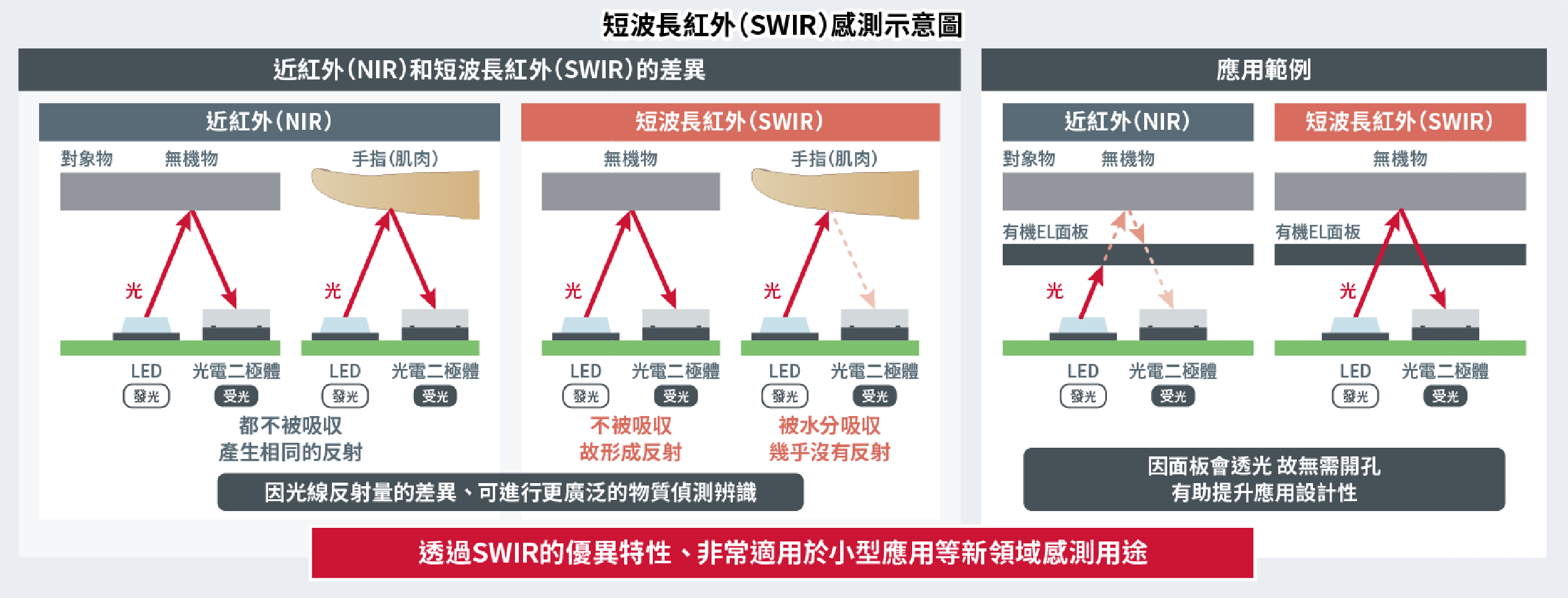 與近紅外(NIR:Near Infrared)相比,SWIR的波長更長,對物質的穿透性更強,因透射或吸收物質不同,不易受陽光和煙霧等微小粒子的影響,這些特點將有望進一步擴大對有機EL顯示器、水、氣體和葡萄糖等對象物的感測範圍。另一方面,目前業界存在的問題是市場上的SWIR產品多為插裝型,適用於通訊裝置、工業分析裝置等較大型應用,而適用於小型應用的表面安裝型產品較少。