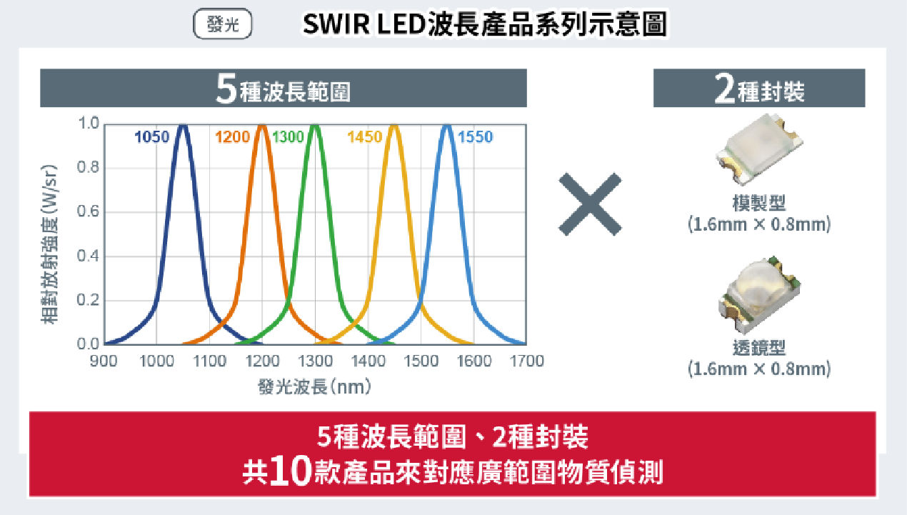由於不同物質的偵測波長不同,因此發光側的SWIR LED預計會推出1050nm、1200nm、1300nm、1450nm、1550nm共5種波長的產品,除了常規的模製型產品外,還將推出兩款透鏡型(發光指向角更窄、輻射強度更高)表面安裝型封裝的產品。屆時,透過這些產品的組合預計會推出10款新產品,這將有助擴大偵測範圍,在偵測水、氣體和葡萄糖等物質的有無以及成分分析等應用中發揮重要作用。