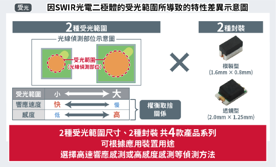 對於受光側的SWIR光電二極體而言,存在一些難以兼顧的參數,比如光的偵測面積較小時,要求響應速度要快,面積較大時要求靈敏度要高。因此,ROHM計畫推出由兩種受光直徑和兩種封裝組合而成、共4款的新機型。客戶可以根據高速響應感測用途和微弱光源感測用途等不同應用需求進行選擇。